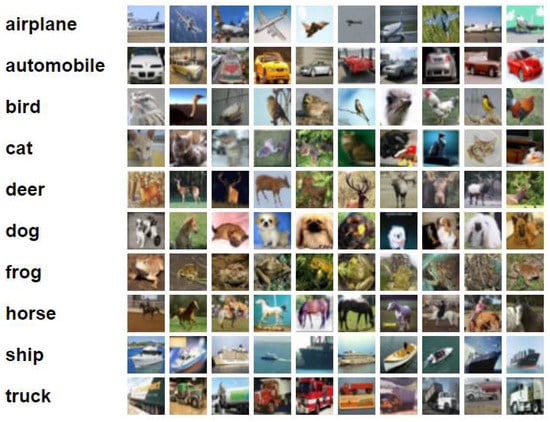CIFAR-10 is provided by Krizhevsky et al. of the Hinton team [6]. There are 60,000 color images in total. Fifty thousand images were used for training, and 10,000 images were used for testing in the data set. The size of these images was 32 × 32, and they had three channels and a total of 10 categories. Every category contained 5000 training images and 1000 testing images. The testing batch contained 1000 randomly selected images from each category, and the training batch contained the remanent images in random order. The figure below shows 10 categories in the data set, and each category contained 10 random images, as shown in Figure 1.