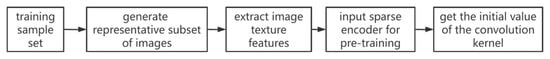 In order to make the convolution kernel and the sample training have a better matching degree and shorten the training time of the CNN network, an improved convolution kernel initialization method was proposed in this paper. Firstly, some typical sample images were selected. The sample features had greater similarity to the images of the same category in the training sample; therefore, the typical local features of some images that were extracted randomly from a certain category were able to represent the main features of this category to an extent. In the training sample set, some sample images were selected to construct a typical image subset from the subset representing each category. Then the LBP algorithm was applied to the typical image subset in order to extract the texture information. At last, the texture information was divided into several small blocks and was input into the sparse autoencoder for pre-training. After the training was completed, a set of filters that met the statistical characteristics of the dataset were obtained, and these filters were used to assign initial values to the convolution kernel of the CNN network. The entire process of the method is shown in Figure 2.