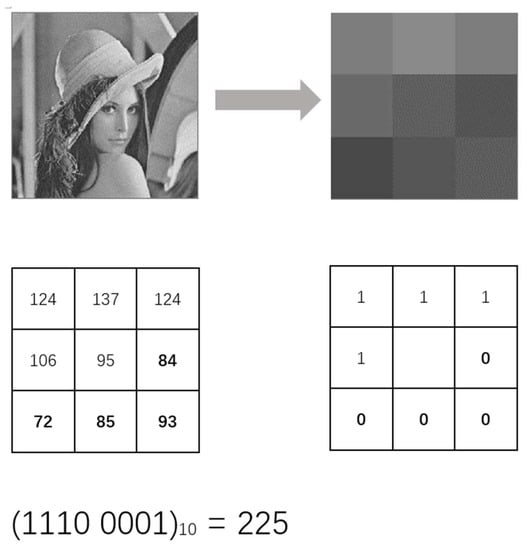 The original LBP operator is defined in the window whose size is 3 × 3. The central pixel of the window is the threshold that is compared with the gray value of the adjacent 8 pixels. If the surrounding pixel value is bigger than the central pixel value, the surrounding pixel value is marked as 1; otherwise, it is 0. The 8-bit binary number is obtained after comparing, which is the LBP operator. Because it is an 8-bit binary number, there are 256 values in total. The values are used to represent the texture information of the area. The whole process is shown in Figure 3, and the formula is shown in (6).