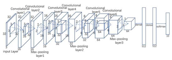 In order to verify the effectiveness of the initialization method, three initialization methods were designed to classify the CIFAR-10 data set, which were the Xavier random initialization method, the He random initialization method, and the initialization method based on LBP and SAE in this paper. These three methods were used respectively to initialize the convolution kernel of the first convolution layer in the CNN model. The CNN model was implemented using the TensorFlow framework. In the model, the operation of “two convolutions and one pooling” was performed alternately, then the two fully connection layers were connected; finally, the output layer used the softmax classifier to divide the images into 10 categories. The activation function was Relu, the update of the weight parameter used the Adam algorithm, and the loss function was the cross-entropy. The input of the network was the image whose size was 32 × 32 × 3 in the training set. The specific network structure diagram is shown in Figure 8. The basic parameter value of the network is shown in Table 2.