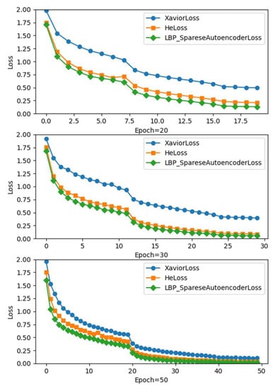 Table 3 shows one of the several CNN training results. Although the recognition rate of the CNN for the test data was not exactly the same after each training, the result of each training was that the method proposed in this paper had a higher recognition rate. In this result, as the iteration times increased, the recognition rates of the three initialization methods improved. However, when the iteration times were increased to an extent, the recognition rate of the network was basically unchanged. Because as the iteration times increased, the network model gradually converged. When the network iterated 20 times, using the Xavier initialization method, the recognition accuracy was 73.93%, and using the He initialization method, the recognition accuracy was 78.51%. Compared with the Xavier method, the He method increased the recognition rate of the network by 4.58%. Using the initialization method based on LBP and SAE that was proposed in this paper, the recognition accuracy was 81.59%. Compared with the Xavier method and the He method, the network recognition rate increased by 7.66% and 3.08%, respectively. When the network iterated 30 times, the method respectively increased the recognition rate by 6% and 3.02% compared with the previous two methods. When the network iterated 50 times, the recognition rate of the network was also increased. In addition, Figure 9 shows the results of training using the three different initialization methods. It was apparent that the loss of the convolution kernel initialization method based on LBP and SAE decreases faster. Compared with the other two initialization methods, the network converged and reached the minimum faster. The experimental result indicated the effectiveness and versatility of the convolution kernel initialization method based on LBP and SAE, which made the recognition rate of the network improve to an extent and the network converged faster.