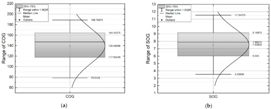 This figure shows a box plot and a normal distribution form to identify the statistical characteristics of the data used for analysis. (a) As a result of showing the COG, the mean value is about 139.5°, 25% and 75% of the data distribution are analyzed from about 118° to 164°. (b) As a result of representing SOG, the mean value was about 7.5 kts, 25% and 75% of the data distribution were analyzed from about 6 kts to about 9 kts. (c) GT of the ship by showing the results; it can be seen that the mean value is analyzed as about 22,241 tons, and the outlier appears as a value of 73,756 tons. (d) As a result of showing the LOA, the distribution of percentage was analyzed from about 111 to 138 m.