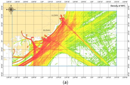 As the result of analysis of maritime traffic density in sea Area 7, the sea area with the highest traffic volume in Korea (a) shows 90% of the total sea traffic volume and shows that all sea areas are covered (b) of the total sea traffic volume. The result shows 75%, and the result is relatively less than 90%. (c) The result shows 50% of the total maritime traffic and shows the main maritime routes.