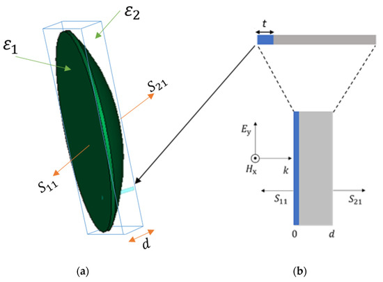 The semi-spherical lens (see Figure 1a) is assumed as a slab with thickness d to investigate if it is an effective refractive index at each position on the lens. The lens slab consists of two materials, regardless the other material is air or not. Calculating the scattering parameters of the whole lens slab (Figure 1a) cannot give the required information about the effective refractive index at each position. Therefore, to investigate the value of the effective refractive index at any position on the slab lens, a small square point in the lens is taken and expanded to take slab shape (as shown in Figure 1b). For normal incident plane waves on the slab, the relationships between the complex refractive index () with the S-parameters [23,24] are given by: