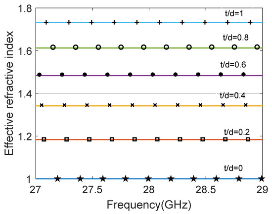 The scattering parameters ( and ) are determined numerically using a full-wave simulator for a vertically polarized plane wave normally incident on the investigated slabs with different ratios (0, 0.2, 0.4, 0.6, 0.8, 1). A finite element method (FEM) solver in CST is used to obtain the approximate solution of the electromagnetic boundary problem. Floquet’s ports are assigned using the unit cell boundaries with normal incidence. The corresponding effective refractive index is computed from the numerical scattering parameters data (see Equation (1)) and presented in Figure 2.