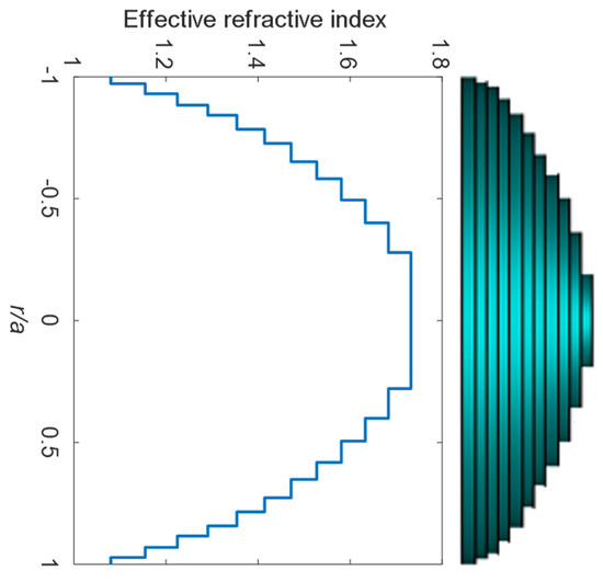 The graded effective refractive index of eleven dielectric slabs, with aperture area diameter, a = 64 mm, and slab thickness, tΔ = 1 mm.