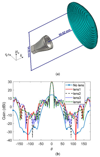 (a) The designed lens 2 with the horn antenna. (b) The co-polarized radiation pattern of the horn antenna with and without a dielectric slabs-based lens using the finite integration technique (FIT) solvers in CST. The aperture area of the designed lens is a = 64.52 mm, and the horn antenna is placed at the optimized focal point (f = 50.62 mm).