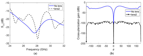 The reflection coefficient of the antenna port with and without the designed lens 2 is shown in Figure 5a. For both results, the is below −10 dB over all the investigated bands. Figure 5b shows the cross-polarization gain with and without the designed lens 2. There is evidence of enhancement in the cross-polarization level when lens 2 is used.