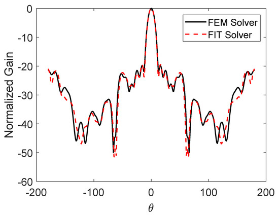 Figure 6 shows the co-polarized radiation pattern of the horn antenna with the designed lens (lens 2), validated using two different full-wave solvers, which are the finite element method (FEM) and the finite integration technique (FIT) solvers in CST. The finite element method (FEM) uses swiping frequency excitation waves with a tetrahedral mesh of 234,024 cells. The FIT solver uses the gaussian excitation pulse with a hexahedral mesh of 851,250 cells.