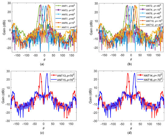 Co-polarized radiation patterns of sixteen switchable horn antennas with the proposed reconfigurable dielectric lens. (a) Antennas 1, 3, 5, 7, 9 and 11. (b) Antennas 2, 4, 6, 8, 10 and 12. (c) Antennas 13 and 15. (d) Antennas 14 and 16.