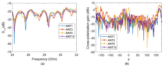 (a) The reflected scattering parameter and (b) cross-polarization gain of four selected antennas.