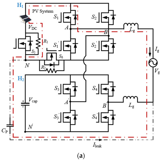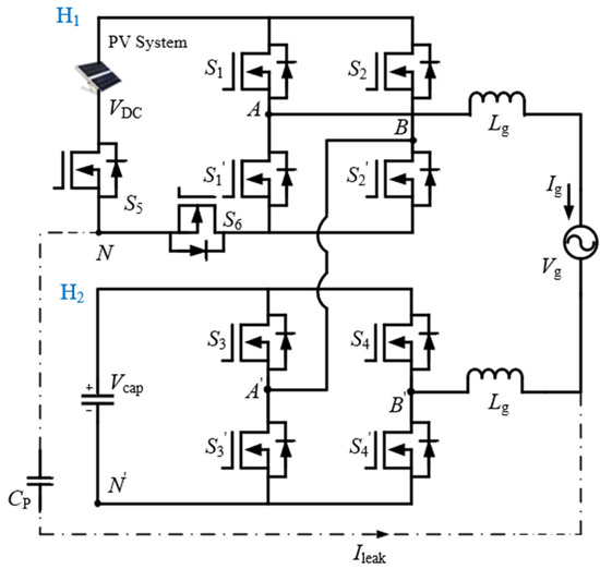 The grid-tied photovoltaic (PV) converters need to be designed for high efficiency, small size, and low cost and weight [12]. These converters use line-frequency transformers to provide galvanic isolation, which makes the overall system bulky. However, few PV converters use high-frequency converters for galvanic isolation [12]. The high-frequency isolation transformers are smaller than line-frequency transformers, but high-frequency transformer-based power converters have many power stages, which increase the system’s complexity and reduce the system’s efficiency. Currently, the transformerless PV converters are extensively used in low-power distributed PV generation by imposing DIN VDE 0126-1-1 standards [13]. Due to the removal of transformers, the leakage current appears in the system because of changes in common-mode voltage (CMV) across the parasitic capacitance, which appears between the PV module and the ground [12]. Moreover, the leakage current leads to safety issues in the system, power losses, harmonic distortion in grid current, and electromagnetic interference issues. Therefore, they must be limited within a utilitarian boundary [13].