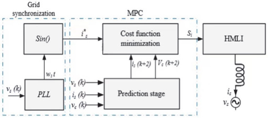 Among the reported control schemes, model predictive control (MPC) is one of the better control schemes because of its robust dynamic and static characteristics. In this work, an optimized finite control set (FCS) MPC is utilized for overall control and for reducing leakage current from PV panels [27,28,29,30,31,32]. This paper uses a transformerless HMLI PV system that synthesizes different multilevel output voltage levels. Capacitor voltage balancing and the elimination of leakage current is achieved through a modified FCS-MPC scheme. The number of computational burdens is minimized to attain optimum results by adjusting the selection of switching vectors. The control algorithm is also optimized for compilation in any microcontroller. Normalization and weighted techniques are also implemented to obtain improved results [32].