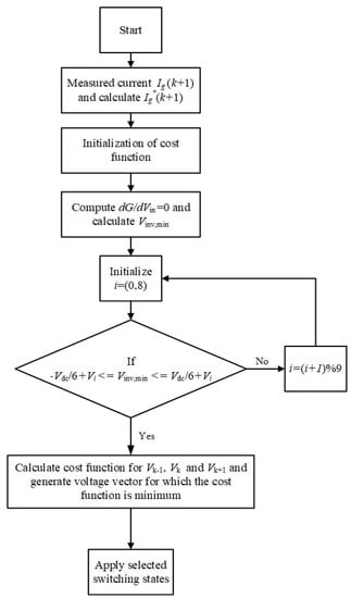As the slope of Equation (15) is negative, it ascertains that minimum voltage is generated. Vinv is bound to V(p-p). It needs to be cut to allow the choice of the correct voltage vectors. Out of the chosen voltage vectors, a maximum of three are hard-coded. When Vmin is within the constrained voltage range, the modified MCP loop iterates through only three vectors to predict the vector that will provide the minimum-cost value. A detailed explanation is shown in Figure 3. The program iterates follow CF minimisation. These modifications lessen the running time per multiple iteration. The computational time is reduced because of the modifications, as outlined in Table 2.