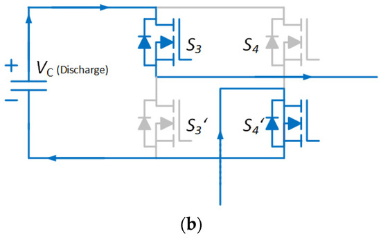 For capacitor voltage balance, the capacitor voltage is compared to the desired reference voltage. The charging and discharging occurs because of the switching action of S3 and S4, as depicted in Figure 4. Charging occurs when switches S4 and S3′ are turned on and charging occurs when S3 and S4′ are turned on, as shown in Figure 4a,b, respectively. It also depends on the current flowing through the capacitor and is taken to realise a mathematical model of capacitor voltage balance. The voltage of the capacitor (working as source in the H2 bridge) is repesented by adding it as one more term to the CF. To predict capacitor voltage (Vc) for the next sampling instant, the relation between current and voltage variation can be written in Equations (16) and (17) as follows: