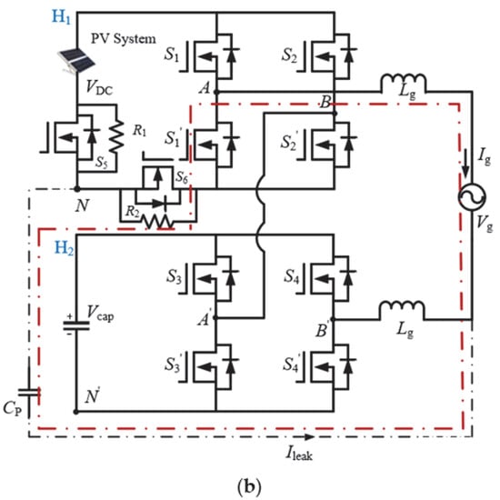 Solar modules are typically connected to PV converters, which convert variable DC output to AC (line frequency) for commercial grid applications. Several power converters reported in literature, such as two- and three-level inverters, H5, H6, and HERIC, have found commercial and academic research acceptance [14,15,16]. Traditional inverters are unable to provide high efficiency at higher power ratings; therefore, converter topologies are moving toward multilevel structures. Among the various multilevel inverters, cascaded H-bridge multilevel inverters (CHB-MLI) have several advantages as compared to other converters [17,18,19,20,21]. The use of CHB inverters also opens up the prospect for removal of transformers from PV systems. MLIs are more attractive because of their lower device stress and low dv/dt. A CHB made up of n full bridges (4n power switches) can synthesize 2n + 1 voltage levels when the supply voltage is the same for each full bridge. Reduction in switches per output voltage levels can be achieved in CHB structures easily, if different supply voltages are selected for each full H-bridge [20]. Due to the higher number of DC voltage sources used in CHB-MLIs, their application is restricted for higher voltage levels. In due course, asymmetrical CHBs will evolve, until DC voltage sources can be replaced by capacitors. The topology used in this paper consists of two asymmetrical H-bridges and is known as hybrid MLI (HMLI) for generating nine output voltage levels. The DC voltage source (in place of a PV panel) supplies one of the full H-bridges, whereas a capacitor supplies the other one. By appropriately controlling the ratio between the two voltages, different output levels can be generated. This facilitates the elimination of bulky transformers, which makes the overall system lighter and more efficient. However, the removal of the transformer gives rise to leakage current. Due to the change in CMV, leakage current flows though the PV panel, which depreciates the lifespans of the PV modules.