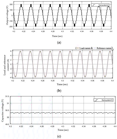 All the voltage levels observed in the output are 200 V, 150 V, 100 V, 50 V, 0 V, −50 V, −100 V, −150 V, and −200 V, respectively, at 50 Hz. In Figure 6b, the output current and reference current are depicted. From this figure, it can be clearly observed that load current is precisely tracking the reference current. The peak-peak current is 12 A, where the blue line shows the reference current and the red line shows the output current. This demonstrates the quick adaptiveness of the modified MPC algorithm. From these above figures, we can conclude that the system-output voltage and current are perfect according to the theoretical analysis.