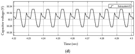 The capacitor voltage waveform is balanced at 50 V, as shown in Figure 6c. The capacitor voltage value has a maximum variation of less than 0.25 V (approximately). It is between 50 V and 52 V for a current range of 1 A to 6 A, which shows the effectiveness of capacitor voltage balancing. In Figure 6d, the magnified capacitor voltage is shown for a small interval. In this figure, the capacitor charging and discharging cycles are clearly visible. Whenever capacitor voltage is increased from the reference value, the controller applies the required voltage vector, which discharges the capacitor, and tries to bring it to the reference value. A similar control method is applied to increase capacitor voltage. This process is repeated and the controller balances the capacitor voltage at the desired value. Thus, we can conclude that the simulation is working properly and in accordance with the theoretical analysis.