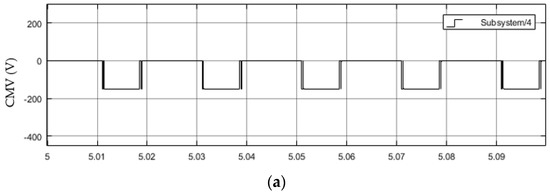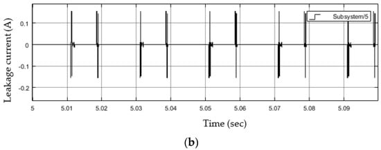 To show the variation of leakage current in HMLI, the waveform for leakage current and CMV are shown for the transient circuit (TC) in disabled and enabled conditions. Figure 7a,b show CMV and leakage current in the disabled TC and leakage current occurs around 30 mA. Figure 8a,b show CMV and leakage current when the TC is enabled and leakage current occurs around 19 mA.