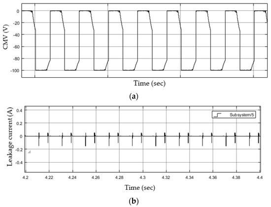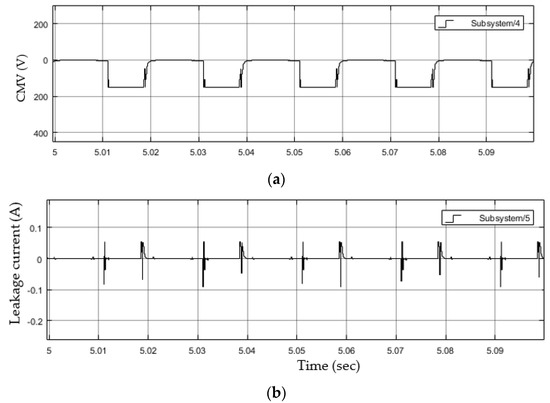 Simulation results of HMLI (enabled TC): (a) common mode voltage, and (b) leakage current.