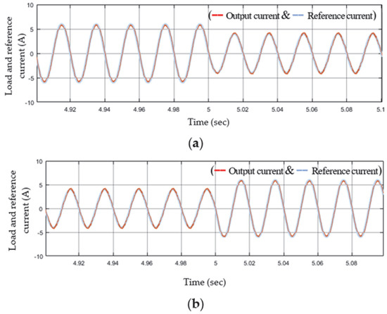 For verifying the dynamic performance of the controller, some parameters are changed during the running condition. The simulation is tested when the current reference is changed from 4 A to 6 A and vice-versa. The effect of these transitions on the load current are shown in Figure 9a,b, respectively. From Figure 9a,b, it can be observed that when the reference current is changed at 5 s, the load current is changed to track the reference current. The output current is tracking the reference current accurately whether its amplitude is increased, decreased, or kept constant. Thus, the smooth closed loop control and fast dynamic response of the proposed control scheme is verified.
