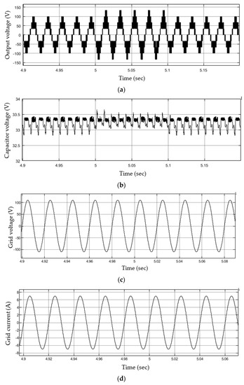 The PV system leakage current standards are provided according to grid safety and regulation. Hence, it is necessary to check leakage current minimization in grid-connected mode. The necessary parameter values are provided in Table 4. The dynamic simulation results are presented here, in which the current is increased at 5 s and decreased at 5.1 s to show the fast dynamic response of the system in grid-connected mode. The grid connection control is implemented using PLL, which provides a phase angle for the current. The provided phase is used with a sine function and a constant magnitude to generate the current reference. Figure 10a shows output voltage levels of grid-connected HMLI. For the current reference of 6 A, HMLI generates seven levels as there is no requirement for two levels (133 V, −133 V) for low current generation. For the current reference of 7 A, HMLI outputs nine voltage levels (−133.33 V, −100 V, −66.66 V, −33.33 V, 0 V, 33.33 V, 66.66 V, 100 V, and 133 V).