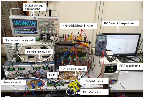 For experimental validation, the system parameters are taken as the same as in the simulation. The components used for the experiment are given in Table 5. The sensor circuits and signal conditioning circuits are designed. The photograph of the experimental setup of the HMLI is shown in Figure 12. In Bridge H1, DC voltage is taken as 100 V and the magnitude of the reference current is set at 6.5 A. To represent the parasitic capacitance of the PV panel, a 100 nF capacitor is inserted into the circuit. Sampling is done at 20 kHz and the setup is tested first for R-L loads of 15 Ω and 2 mH.