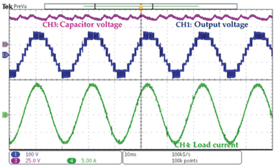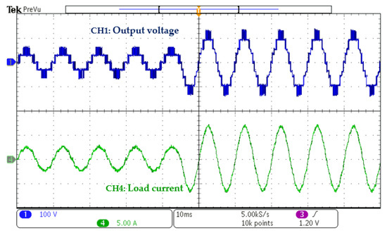 The experiment was carried for a 600 W laboratory prototype. The steady-state output voltage and load current waveform are shown in Figure 13. The nine-level voltage waveform has been generated at the output of the HMLI. It consists of 0, ±33.33 V, ±66.66 V, ±100 V, and ±133.33 V output voltage levels. The voltage of the capacitor is balanced at 33 V. The output voltage and current magnitude are approximately 84.8 V and 7.05 A (RMS), respectively. The leakage current and CMV waveform are shown in Figure 14. The obtained RMS current is around 20 mA and it can vary within 5% of the given value because of precision errors of the measuring instrument.