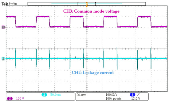 Common mode voltage (CH3) and leakage current (CH2) waveform.