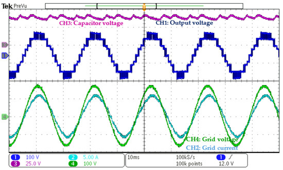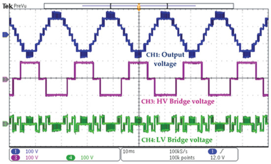 The output voltage of the high voltage (HV) bridge and low voltage (LV) bridge are shown in Figure 15. The important observation to make in Figure 15 is that the voltage switchings of the HV bridge happen only in limited time intervals during a period of grid voltage. Leakage current is also minimized as the legs of HV bridge have a DC supply as a PV panel. The HMLI has also been experimentally validated at grid voltage 110 V (RMS). The grid current is precisely regulated to synchronize with the grid voltage. The grid voltage and current are depicted in Figure 16. The control strategy effectively balances the capacitor voltage balancing and tracks the reference current.