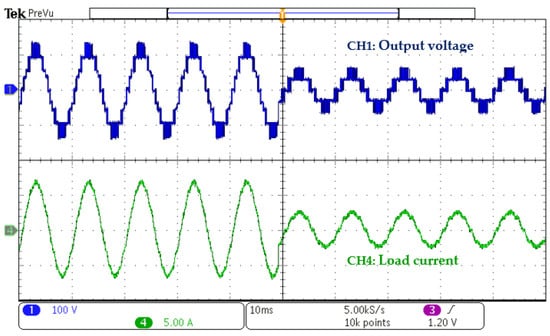 Figure 17 and Figure 18 show the dynamics of the output voltage for increasing and decreasing currents, respectively. For the low-current value, the control algorithm does not choose high voltage levels as the resistance value is fixed. Hence, at 3 A (peak) current, HMLI generates only five levels. In Figure 17, the current reference is decreased from 7 A (peak) to 3 A (peak) and the opposite sequence is implemented for Figure 18. From both of the figures, it can be confirmed that the proposed MPC provides a fast dynamic response.