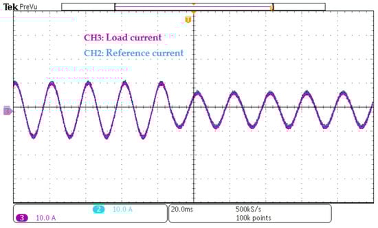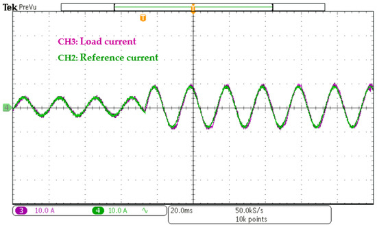 The load current dynamics of the proposed controller is also experimentally validated in Figure 19 and Figure 20, respectively, which show that the load current tracks quickly for increased and decreased reference currents, respectively. The system shows excellent dynamic results using the proposed control scheme.