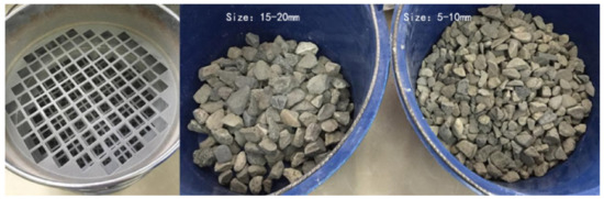 Natural aggregates were used in this study. According to the sieve diameter and particle size distribution, the aggregates were divided into two groups, 5–10 and 15–20 mm, and the bulk densities were 1575 and 1555 kg/m3, respectively. Sieves were used to obtain particles based on their diameter (Figure 1). All aggregates were thoroughly washed to avoid any negative impacts on concrete stability properties and other mechanical behaviours.