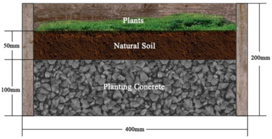 Vegetation experiments were conducted after the compressive strength tests. PC was poured into 18 wooden moulds with dimensions of 400 × 400 × 200 mm, and a 50 mm natural soil layer was precisely placed on the concrete, which was able to retain water and fertilizer (Figure 2). Plant seeds were evenly sown in the soil at 10–12 g/m2 according to the literature and then covered with a thin layer of natural soil (5 mm).