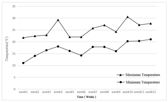 Three kinds of plants were cultivated in planting containers after the void ratio, alkalinity, and mechanical property tests were performed. Twenty-seven planting containers were divided into three groups with three replicates per sample: small-particle concrete (SC), large-particle concrete (LC), and nonconcrete (NC). Figure 3 shows the average temperature as an environmental factor over the test duration. The weekly average maximum temperature was 25.2 °C, and the weekly average minimum temperature was 16.9 °C. The vegetation test began on 1st April and ended in late June, accounting for a total of 12 weeks.