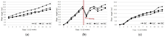 All three plants in NC were taller and grew more steadily than those in the other two treatment groups. The plants in SC were initially slightly shorter than those in NC and LC. They exceeded the plants in LC after adapting to the environment. This phenomenon can be considered a manifestation of the SC plants having a higher resistance than the LC plants. Overall plant growth is clearly shown in Figure 5 and Figure 6.