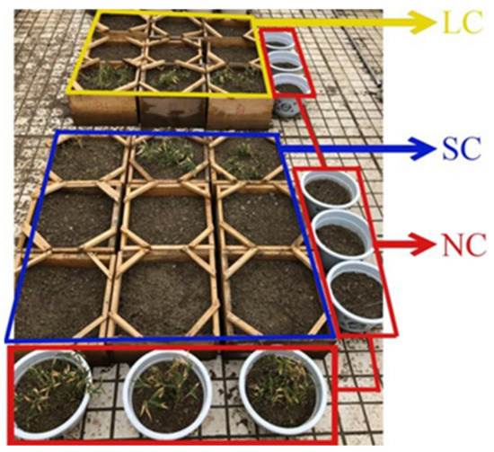 Mature seeds of Cynodon dactylon (L.) Pers and Agrostis stolonifera (known as Bermuda grass) were purchased from commercial seed suppliers. Mature bamboo shoots of Sasa argenteostriatus, e.g., Camus, were transplanted from the nursery garden of Sichuan Agricultural University. The effects of the concrete content on seed germination and plant growth of each species were examined with a comparative experiment that included two concrete treatments based on the particle size of the aggregates, with three replicates, and three replicate tests were also conducted for each plant under normal cultivation conditions without PC underneath as control samples. The other environmental factors were controlled in the tests. The experiments were conducted in the nursery garden of Sichuan Agricultural University, exposed to a natural environment. The seeds and bamboo shoots were watered every two days during the experiments. The PC containers were randomly moved every week to prevent any positional influence according to previous studies [18].