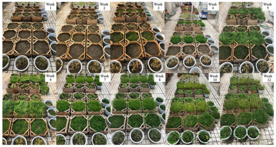 C. dactylon was the fastest growing plant among the tested species. It began to grow faster in the third week, and the aboveground height was approximately 30–35 cm in the sixth week. The average heights in NC and SC were larger than those in LC, and at the end of the sixth week, C. dactylon reached the biomass limit that the containers could bear. The plants were mowed once to encourage growth during the rest of the experiment. The growth rate decreased in the last three weeks, as shown in Figure 4a. One of the reasons was the rising temperature, which opposed their preference for a cooler climate.