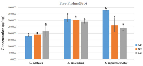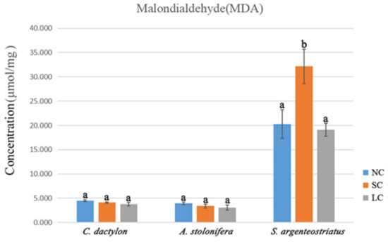 The MDA index fluctuated sharply in the different plant species and treatments, as shown in Figure 7. S. argenteostriatus cultivated in SC containers exhibited a high MDA content (approximately 32.15 μmol/mg on average) because its cytoplasmic membranes had been damaged more than those of the LC and NC plants; the SC value was significantly (p < 0.05) higher than the SC values of the LC and NC plants. This phenomenon means that plants suffered more severe stress damage than other samples. The mean values of the LC and NC plants were 16.99 and 19.42 μmol/mg, respectively, and their outcomes were more stable than those in SC, showing that the cytoplasmic membranes of C. dactylon and A. stolonifera suffered less damage and had better drought resistance.