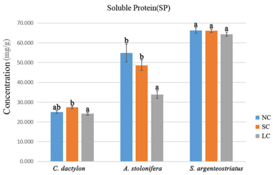 The SP concentration in C. dactylon in SC was 27.361 mg/g, which was significantly (p < 0.05) higher than the concentration of 25.045 mg/g in NC and that of 24.141 mg/g in LC. A. stolonifera in LC, 33.759 mg/g on average, had a highly significant (p < 0.01) lower SP concentration than the SP concentration of 48.620 mg/g in NC and 54.885 mg/g in NC. Figure 9 also reveals that the detected SP accumulations in the treatment groups of S. argenteostriatus are similar, exhibiting a nonsignificant difference, with concentrations ranging from 64.403 mg/g in the LC treatment group to 66.213 mg/g in the NC treatment group. The LC containers resulted in the lowest values for all three plants among all treatments, which illustrated that the plant tissue in LC was not as active as that in SC and NC.