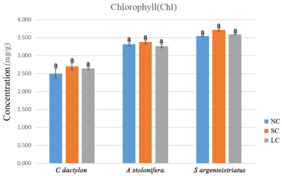 Figure 10 clearly shows that the Chl concentration in the different plants in the treatment groups fluctuated. C. dactylon grew slightly better in the treatment groups than in the NC group. The SC treatment resulted in the highest Chl concentration of 2.698 mg/g on average. The concentration in A. stolonifera cultivated in SC containers was slightly higher than those in the plants cultivated in NC and LC containers, with a nonsignificant difference among the treatments.