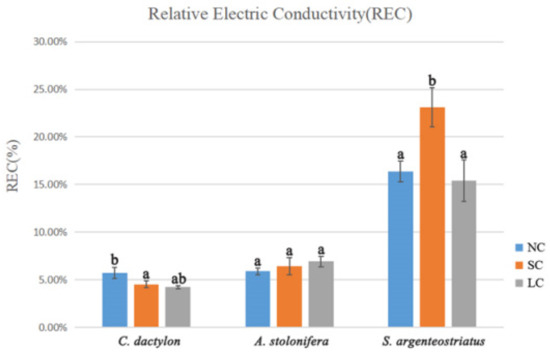 Figure 11 shows the REC among all the different treatments of the plants. The REC differences can be clearly observed. The REC was significantly correlated with MDA. C. dactylon in the NC treatment group had a significantly (p < 0.05) higher REC of 5.71% compared to that in the plants in the SC and LC treatment groups at 4.52% and 4.20%, respectively. The REC in A. stolonifera was opposite to that in C. dactylon, with an LC level of 6.91%. The SC and NC levels were 6.42% and 5.89%, respectively. Compared with the REC indexes of the other two plants, the REC index of S. argenteostriatus in the SC treatment group was significantly higher (p < 0.05), by 23% on average. One of the REC functions is to reflect the extent to which plants have been damaged. Figure 11 clearly reveals that S. argenteostriatus in the SC treatment group suffered more damage than that in the other treatment groups.