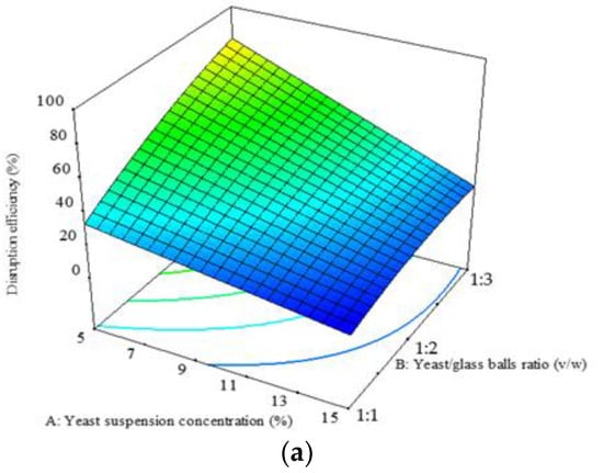 The response surface plots of the combined effects of the factors on spent brewer’s yeast cell disruption efficiency are presented in Figure 2. Yeast cell suspension concentration determined the decrease of disruption efficiency. On the other hand, the increase of the yeast/glass bead ratio and the number of vortexing cycles led to an increase in cell wall disruption efficiency. These observations were supported by previous results obtained by Mao and Moo-Young (1990), who reported that an increase in cell concentration decreases the efficiency of cell rupture [24]. This could have been caused by an insufficient collision between the glass beads and the yeast cells in the effective disruption region as a result of the yeast concentration and cell wall fragments in suspension. Furthermore, Heim et al. (2007) investigated whether a decrease in cell wall disruption rate is caused by a lack of action of the breaking surface formed by the glass beads and high yeast concentration [10]. Vieira et al. (2017) underlined the significant effects (p < 0.05) of spent brewer’s yeast cell lysis temperature and time on the amount of bioactive compounds released [25]. Another study conducted by Ardiyanti and Guntoro (2018) revealed that the highest disruption efficiency (99.5%) was obtained after freezing-defreezing, combined with glass-bead treatment of a 15% spent brewer’s yeast suspension, the results being in line with our data [26].