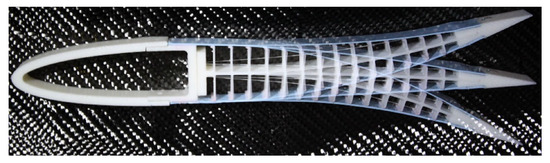The first generation of FishBAC devices was mainly manufactured by 3D printing (Figure 1). The stringers and spine were printed together as a single internal ‘skeleton’. Furthermore, a silicone elastomer skin was pre-stretched and bonded to this skeleton, whereas the pulley mechanisms were manufactured separately and later installed. Kevlar tendons were used to transmit the actuation loads from the servos to the trailing edge of the morphing device. These were anchored to the pulleys on one end and hand-stitched to the trailing edge on the other end [20,21]. Although the 3D printing process is ideal in terms of reducing part count, as the stringers do not need to be later attached to the spine, 3D-printed ABS plastic is not an aerospace-grade material, and its use is far from ideal in terms of its stiffness and strength. However, these prototypes were still key for investigating the aerodynamic benefits of the FishBAC via wind tunnel testing [22].