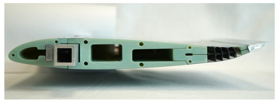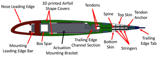 The main objective of this design and manufacturing process is to build a wind tunnel wing model for a quasi-2D wind tunnel test (i.e., a wing that spans the test section). In this application, the wing has to span a 1-m test section; therefore, it was designed to have a wingspan of 995 mm, so that a 2.5 mm gap exists between the wing-tips and the tunnel walls to avoid interference. A NACA 23012 airfoil modified with a trailing-edge tab with a 270 mm chord length was selected. This airfoil matches that of a Bo-105 helicopter, which is the baseline rotor system of the EU Horizon 2020’s Shape Adaptive Blades for Rotorcraft Efficiency (SABRE) project [25], for which this work was carried out. The FishBAC device is located in the rear 25% of the airfoil section (i.e., starting at the location ). Therefore, the front 75% of the airfoil section is rigid and should be robust enough to sustain a maximum testing speed of 50 m s−1 (with a factor of safety of 1.5).