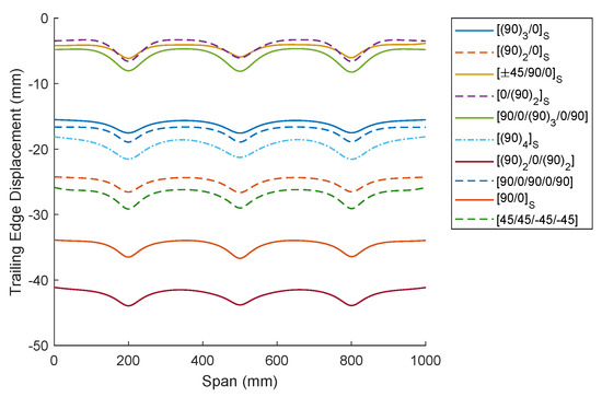 Since this wind tunnel wing model was designed for a quasi-2D wind tunnel test, the achieved deflections should be as uniform as possible (along the span). Therefore, only balanced and symmetric laminates were considered. The two main variables to consider are laminate thickness and stacking sequence. Because carbon fibre prepreg was used in this case, the laminate thickness is determined by the number of plies. Figure 4 includes the results for all the stacking sequences that were considered in the FEM analysis. Since the objective is to select a stacking sequence that both minimises the variations in the transverse deflection along the span and allows achieving large transverse deflections, the selection is performed in terms of the ratio between the minimum and maximum transverse deflections (along the span) and the maximum achievable deflection. It is observed in Table 1 that the best performing laminate according to these objectives is , as it presents the largest deflections under the selected actuation loads and has the lowest variation in transverse displacement along the span. However, it is important to note that this “theoretical”’ maximum displacement is likely an overestimation, as no losses in the actuation mechanism are being considered (e.g., due to mechanical friction in the pulley-tendon system or actuator efficiency factors).