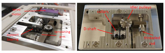 A monolithic actuation frame, machined from 6082-T6 aluminium alloy billet, is mounted in between the front and rear spars. This removable bracket hosts the actuation mechanism (mounts the servo, supports the shaft and tension the tensioning arm) and also connects the two spars, ensuring full load transfer between them. Tendon tensioning is achieved via a tensioning arm, which pivots off of the actuation frame to support a pulley around which the tendon wraps. The arm can be drawn towards the leading edge via a nut on a threaded rod, which increases the path length the tendon must travel, thereby creating variable tendon tension. The initial resting position of the FishBAC can also be adjusted by introducing differential tensioning of the upper and lower tendons via offsetting the tendons at their clamping points on the spooling pulley. Figure 6 shows the components of this actuation mechanism.