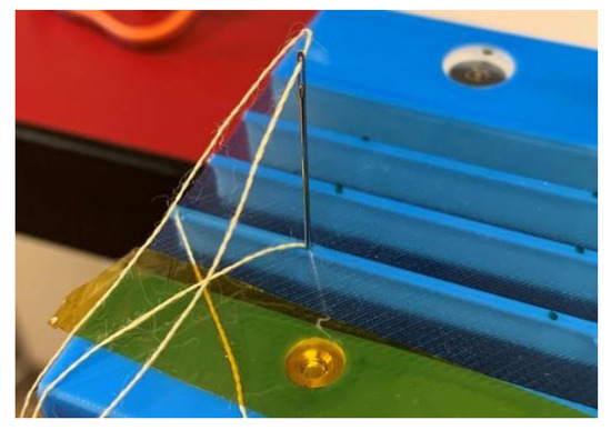 Once the skin panels were fully connected together, the final step in the manufacturing process was to attach them to the wing structure and stitch them to the spine. The skin panel was first folded around the trailing-edge fold and the screwed hand tight to the spine. The wing was then actuated to the maximum deflection to facilitate the pre-tensioning of the skin panels. The tab was screwed down hand tight. This was repeated on the opposite side, and once the alignment was checked, all fasteners were tightened. With the skin firmly attached to the wing, the skins were stitched to the spine. Pliers were used to force a needle with Kevlar thread through the narrow passage between the skin and the stringer. The holes of the opposing skins and the stringers aligned well, as the skin was under tension, which made stitching through the spine relatively straight-forward, as shown in Figure 11. It was made sure that the thread was always under tension as it was not possible to tension once stitched along the entire span due to frictional locking. The thread ends were tied up around a hole in a stringer and then secured using a quick-drying fastener lacquer.