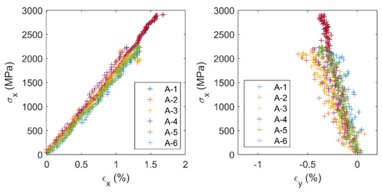 CFRP tensile specimens (0° fibre direction): axial stress vs. axial strain (left) and axial stress vs transverse strain (right).