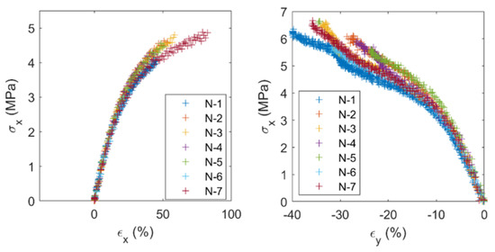 Stress–strain curves of the Ninjaflex material-axial strain (left) and transverse strain (right).